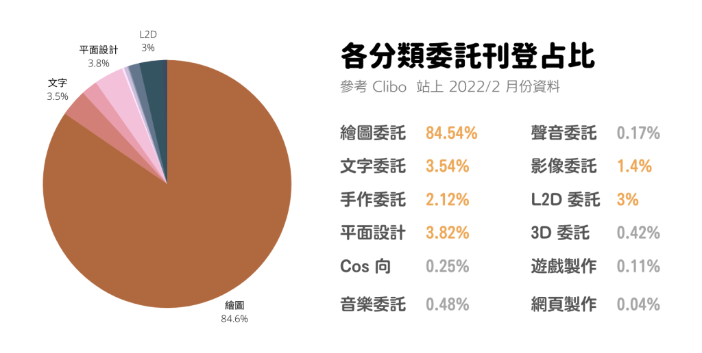 目前在委託項目的刊登上,還是由應用度最廣的「繪圖委託」為最大宗,其次包含排版、浮水印、LOGO、標準字甚至進化到直播開台畫面設計等直播相關的設計內容,與包含小說創作、文案、翻譯內容的「文字委託」也都相當熱門!